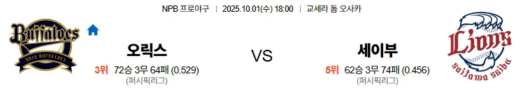10월1일 18:00 오릭스 세이부 NPB 스포츠분석,스포츠중계