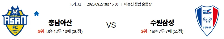 9월27일 16:30 충남아산 수원삼성 K리그2 스포츠분석,스포츠중계